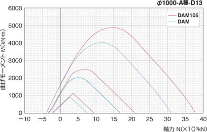 DAM105標準型とDAMの曲げ耐力は、右図に示す通りとなります。(代表としてφ1000-A種-D13の値を示す。)