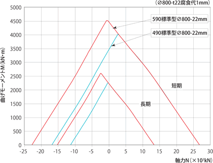 Hi-SC105(標準型)と590-SC105(標準型)の曲げ耐力は、右図に示す通りとなります。(代表として杭径800㎜、鋼管厚22㎜、腐食代1㎜の値を示す)