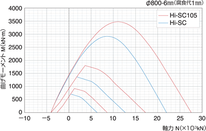 Hi-SC105(標準型)とHi-SC(標準型)の曲げ耐力は、右図に示す通りとなります。(代表として杭径800㎜、鋼管厚6㎜、腐食代1㎜の値を示す。)