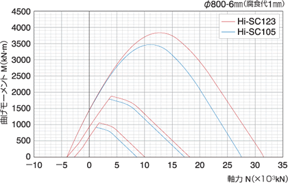 Hi-SC123(標準型)とHi-SC105(標準型)の曲げ耐力は、右図に示す通りとなります。(代表として杭径800㎜、鋼管厚6㎜、腐食代1㎜の値を示す。)